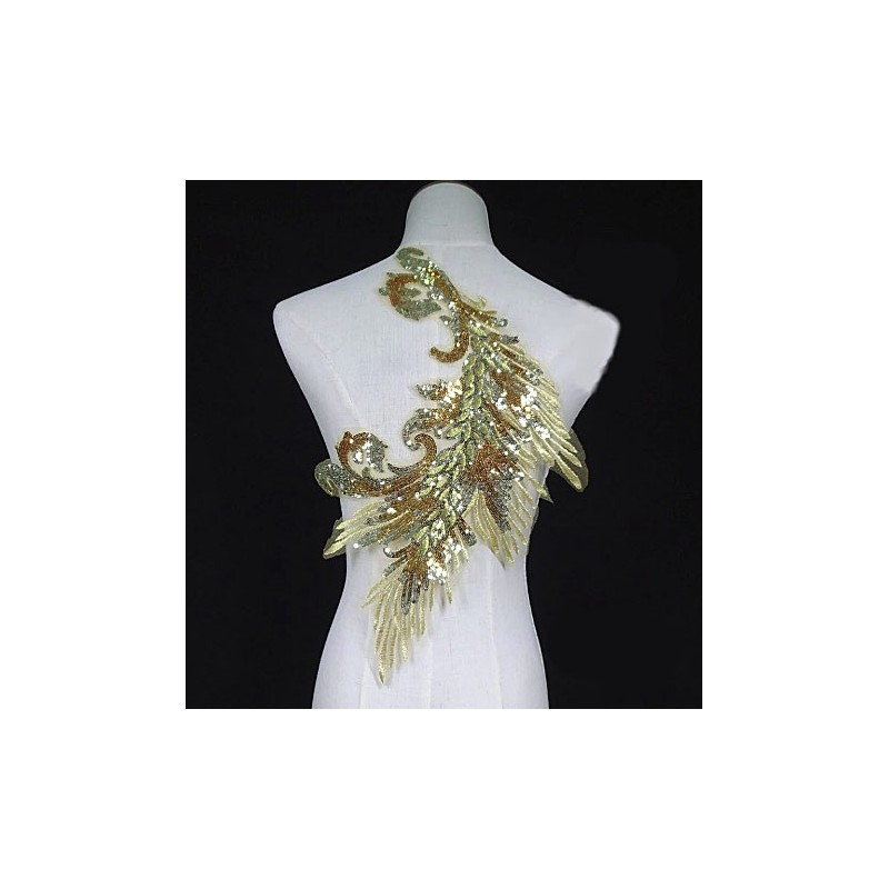 1 pezzo, Pizzo floreale pavone blu e oro, misure cm 25x40 adatti alle decorazioni ed arricchimenti per gli abiti di danza, di pattinaggio ed altro..